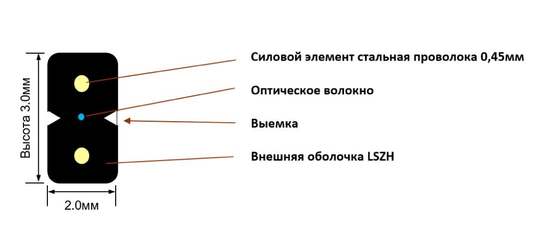 Оптическое волокно находится в центре кабеля. Два параллельных силовых элемента из стальной проволоки расположены с обеих сторон от волокна. Плоская малогабаритная оболочка обеспечивает отличную гибкость и надежную защиту оптических волокон. Внешняя оболочка сделана из малодымного компаунда, не содержащего галогенов (LSZH).